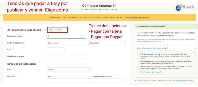 Si vives en un país que acepte Etsy Payments tendrás que registrarte para aceptar pagos de esa forma. Al integrar Paypal solo se te cobrarán las tarifas de Etsy Payments, no las de PayPal, así que no las pagarás doble 😉