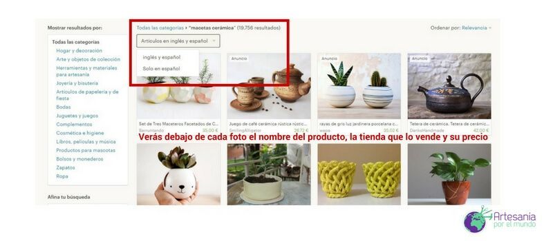 En realidad, todos los resultados que obtengas los vas a leer en español si lo has seleccionado como tu idioma predeterminado porque Etsy los traduce automáticamente.